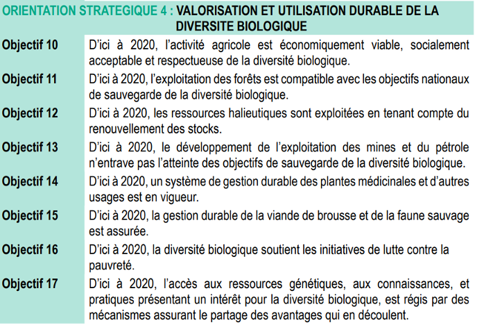 En ce qui concerne, l’utilisation durable des espèces sauvages, la stratégie nationale a retenu comme orientation stratégique 4, la valorisation et l’utilisation durable de la diversité biologique qui se décline en 8 objectifs couvrant de façon pertinente tous les aspects d’intérêt sur cette problématique. L’évaluation du niveau de mise en œuvre de cette stratégie et des défis rencontrés pourrait servir de base afin d’une meilleure opérationnalisation.